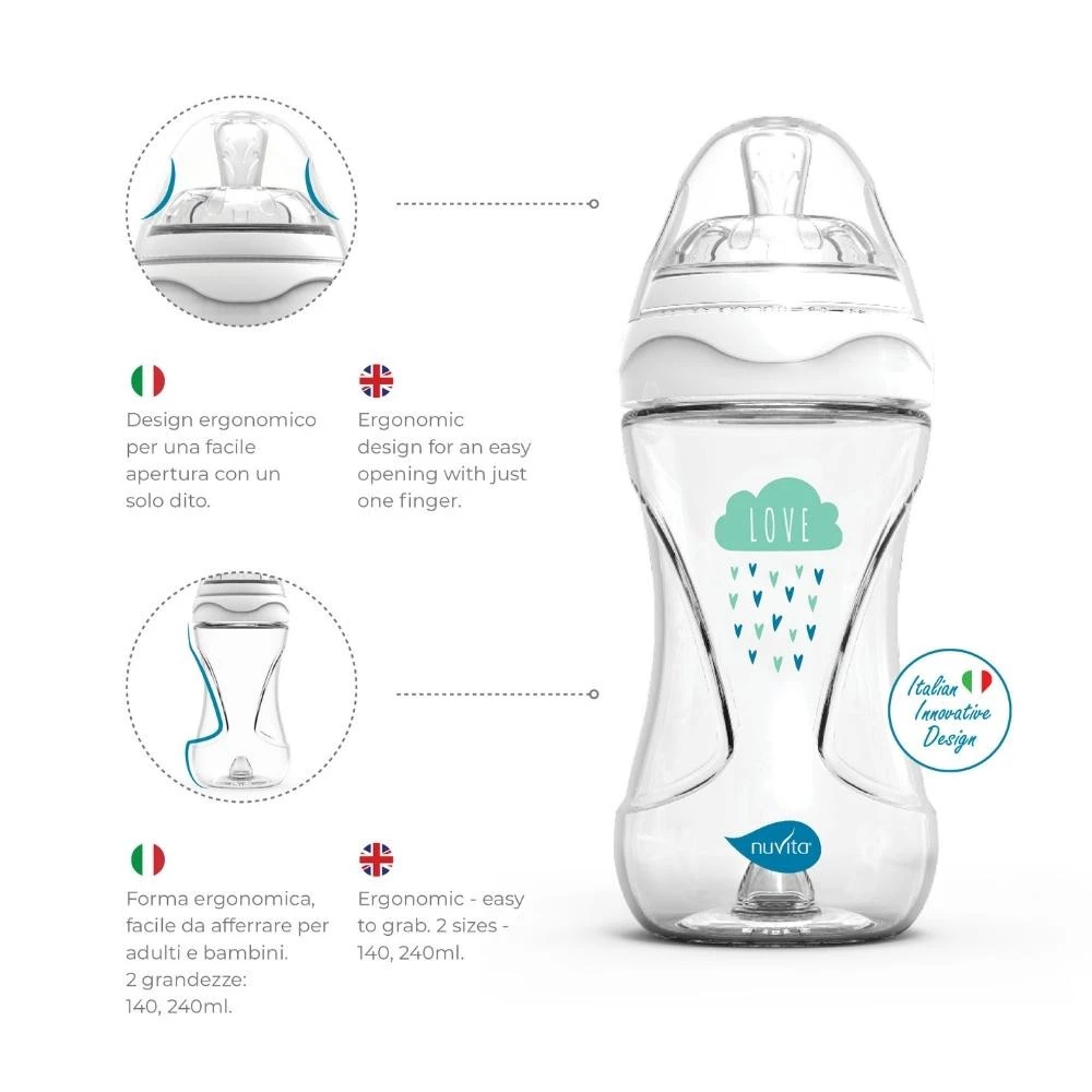 Przez silikonowy zawór powietrze wchodzi z podstawy i zapobiega mieszaniu się z mlekiem; w ten sposób dziecko nie pobiera powietrza podczas karmienia, co stanowi główną przyczynę kolki. Zawór antykolkowy Nuvita można łatwo wyjąć w celu wyczyszczenia dla maksymalnej higieny.
