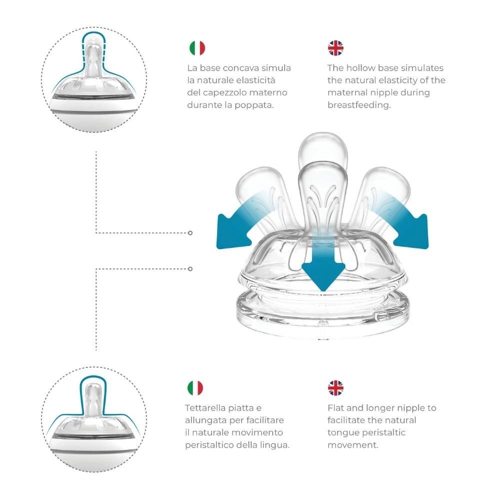 • płaski i wydłużony kształt ułatwia perystaltyczne ruchy języka, dzięki czemu dziecko może wykonywać te same naturalne ruchy, co podczas karmienia piersią.