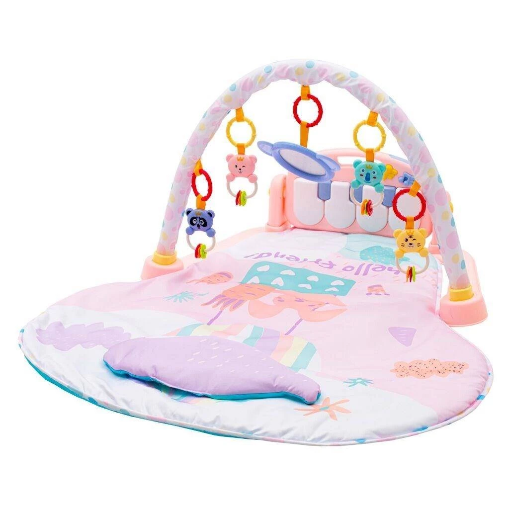 Piękna mata edukacyjna z pałąkiem z zabawkami i grającym pianinkiem rozwija dziecięcą wyobraźnię poprzez poznawanie kolorów i kształtów. Miękka i puchata mata o pomysłowym kroju jest lekka i łatwa do przenoszenia. Częścią maty jest również mała poduszka. Podłączone pianinko działa w trzech trybach: odtwarza muzykę lub jako jako klawisze fortepianika. Wiszące zabawki: grzechotka, grzechoczące zwierzątka i lusterko. Pałąk można odpiąć, podobnie jak zabawki i pianinko. Przyjemny i miękki materiał pozwala wygodnie leżeć na brzuchu lub plecach i umożliwia dziecku swobodne poruszanie się. Mata edukacyjna zapewnia bezpieczną i przyjemną przestrzeń i stanie się ulubionym miejscem zabaw Twojego dziecka.
