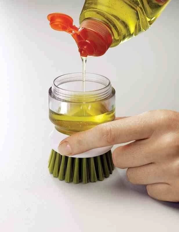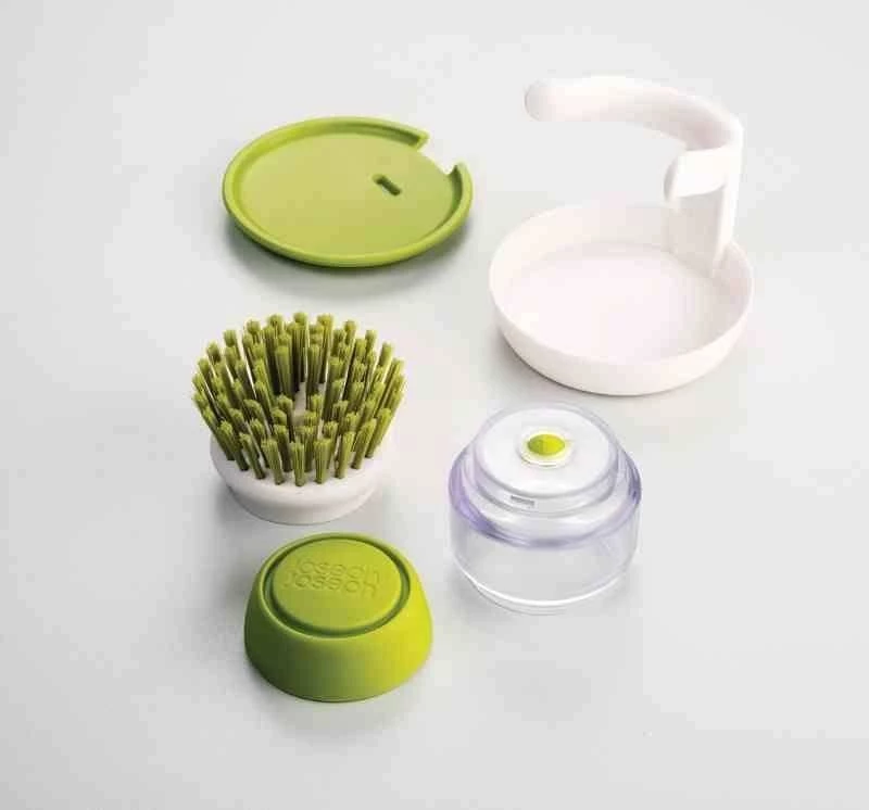 Innowacyjna szczotka do zmywania naczyń z podstawką. Do mycia garnków, patelni i naczyń. Składa się z pojemnika na płyn do mycia, szczotki oraz podstawki z odpływem. Wystarczy odkręcić pojemnik, nalać detergentu, zakręcić, nacisnąć górny przycisk i myć naczynia. Przezroczyste ścianki pozwalają na kontrolę ilości płynu. Przechowywanie szczotki włosiem w dół jest bardziej higieniczne – woda spływa na podstawkę, nie moczy blatów, a szczotka szybciej wysycha. Całość można zdemontować do mycia – myć ręcznie.
