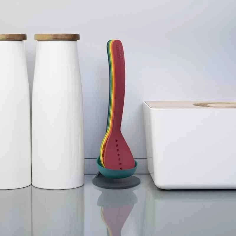 NOWY zestaw narzędzi kuchennych Nest składa się z pięciu łyżek, które dzięki magnesom utrzymują się razem, całość przyczepiona jest do podstawki.