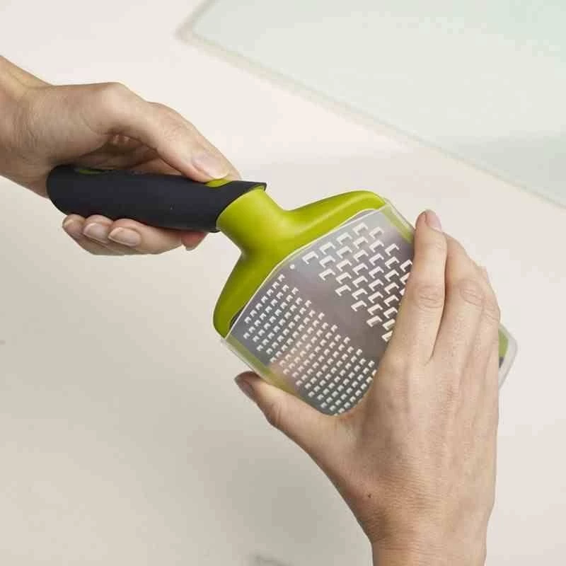 Tarka z dwoma ostrzami, oraz dwoma sposobami tarcia. Tarka może być prosta, kiedy trzech niewielka ilość, bądź złamana przy rączce, co pozwala na oparcie tarki na blacie, w trakcie ucierania dużej ilości warzyw czy sera.