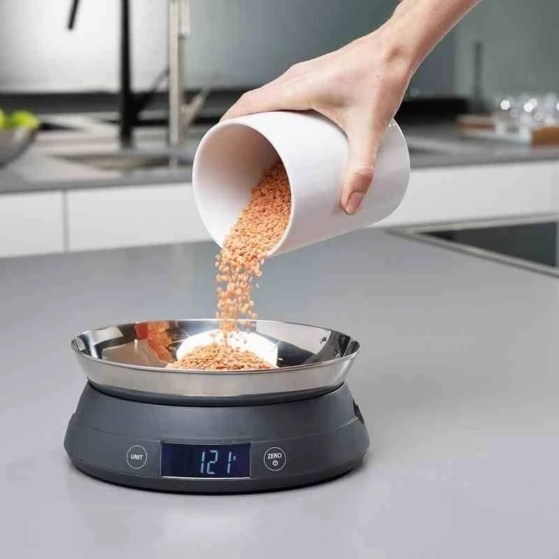 Waga składa się z dwóch części. Podstawa z wyświetlaczem LCD oraz miska, która stanowi pokrywę dla wagi jak również powierzchnie na której można ważyć produkty w torebkach czy innych opakowaniach. Po odwróceniu do miski można nasypać produkty sypkie.