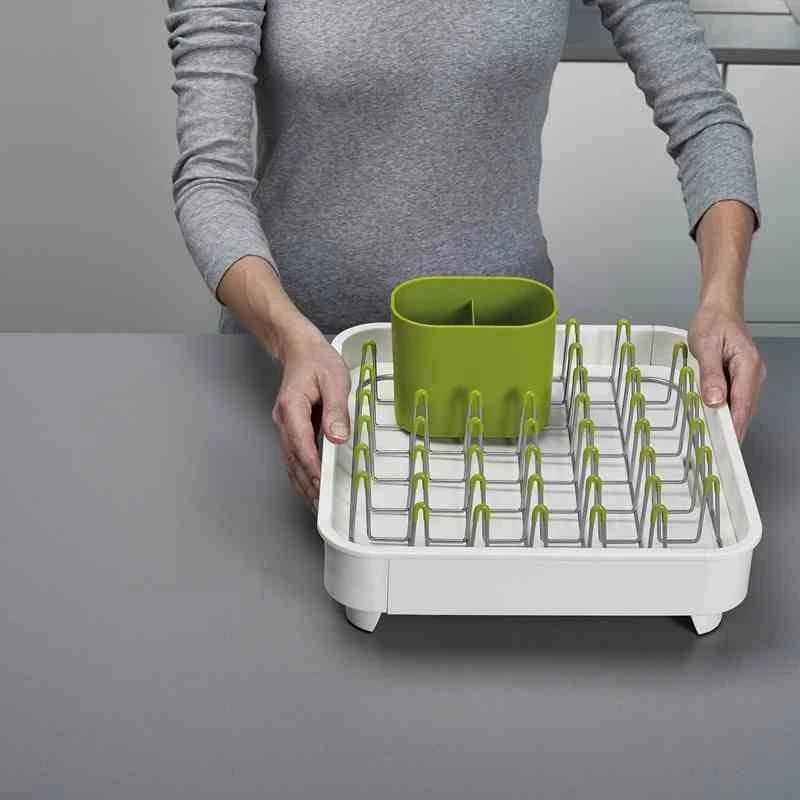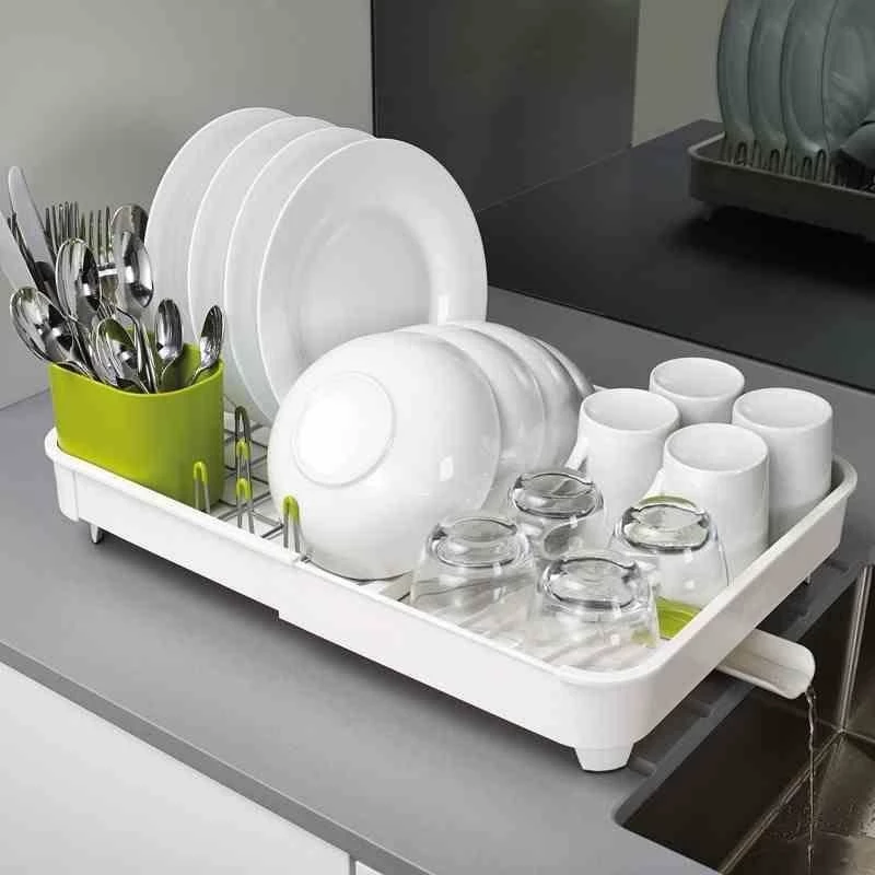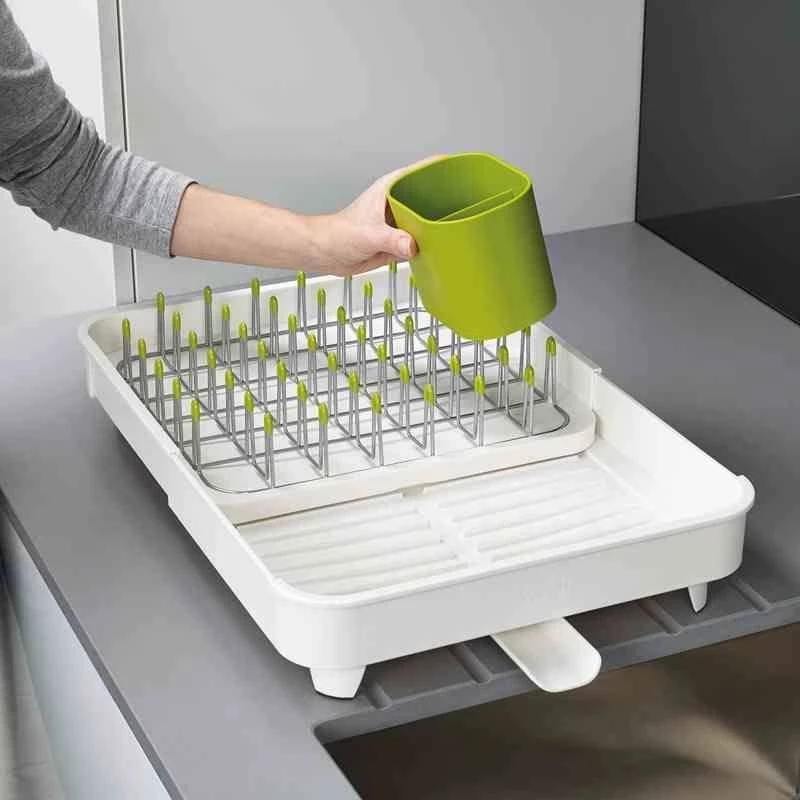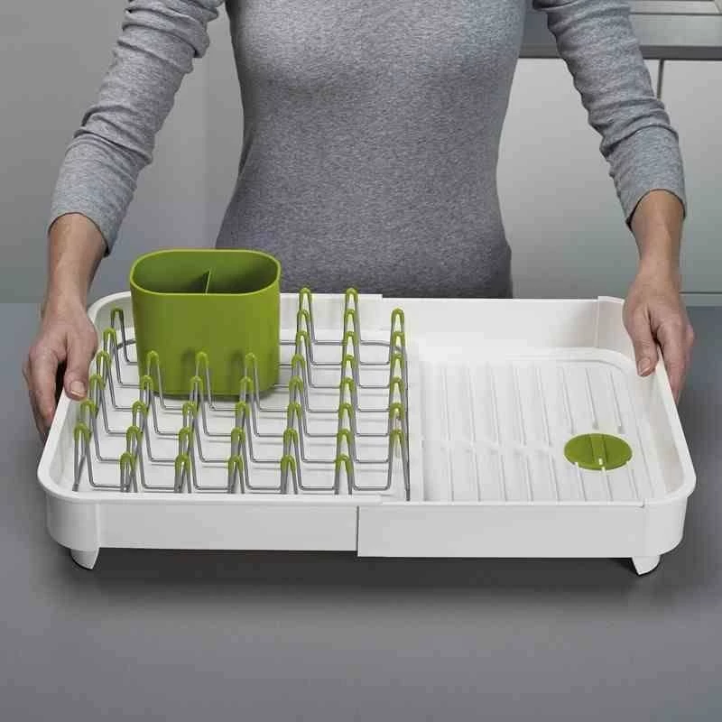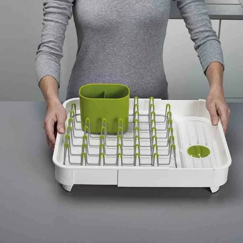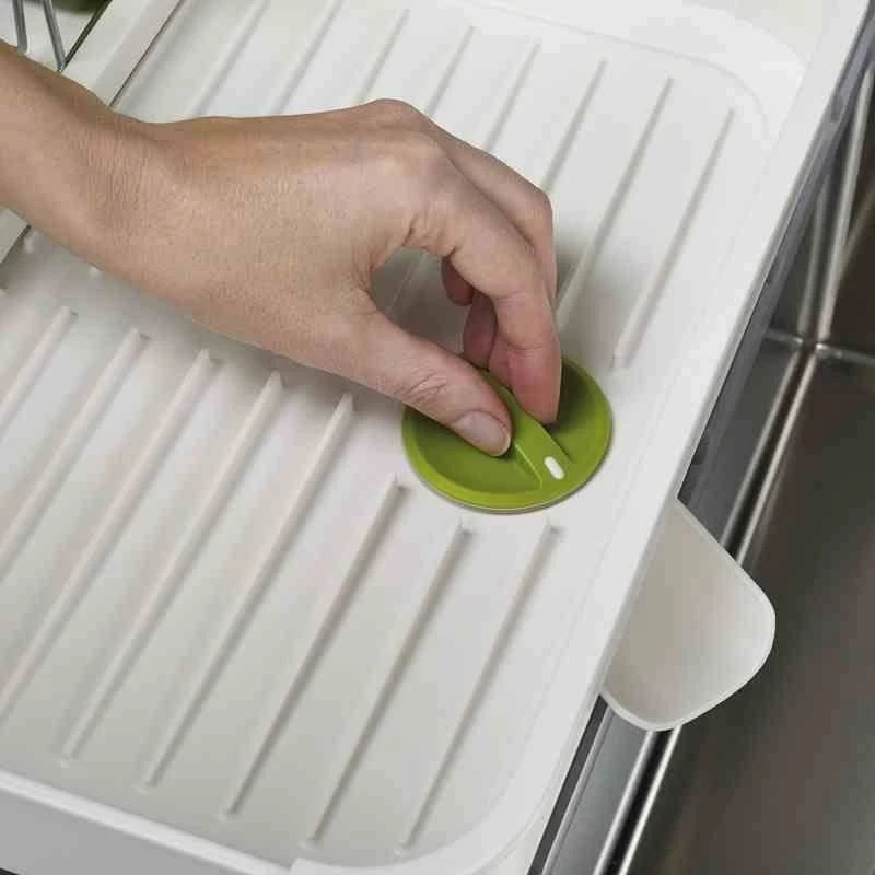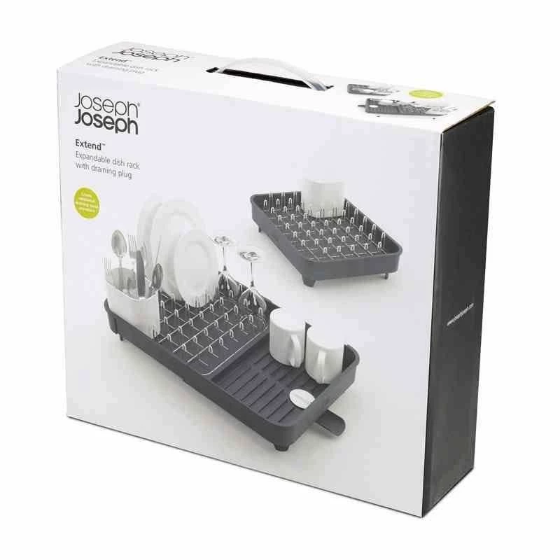 Nowa suszarka Extend, którą z łatwością można powiększyć, gdy tego potrzebujesz. Zaletą suszarki jest możliwość zamykania i otwierania otworu odprowadzającego wodę. Woda może być odprowadzona bezpośrednio do zlewu przy pomocy lejka, bądź zatrzymana w suszarce, co pozwala na suszenie naczyń na blacie z dala od zlewu.