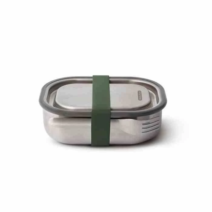 - lunch box wykonany ze stali nierdzewnej i wyposażony w silikonowy pasek przytrzymujący w oliwkowym kolorze,