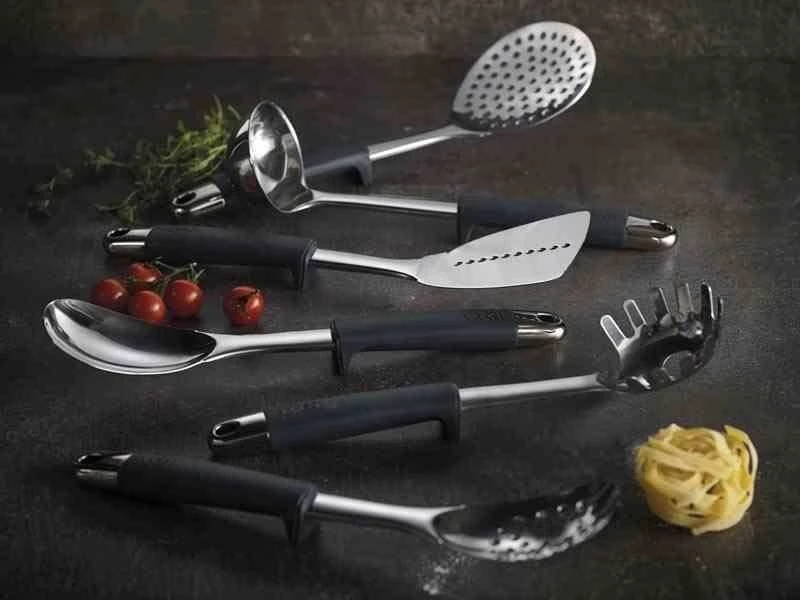 - narzędzia wykonane z polerowanej stali nierdzewnej 18/10, ergonomiczne rączki z silikonu (odporność na temperatury do 270°C),