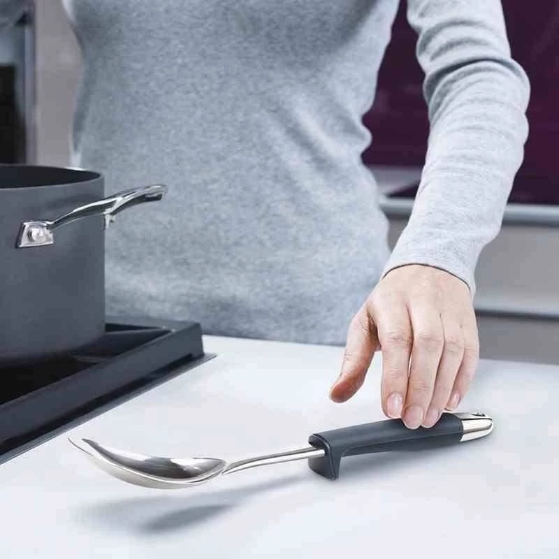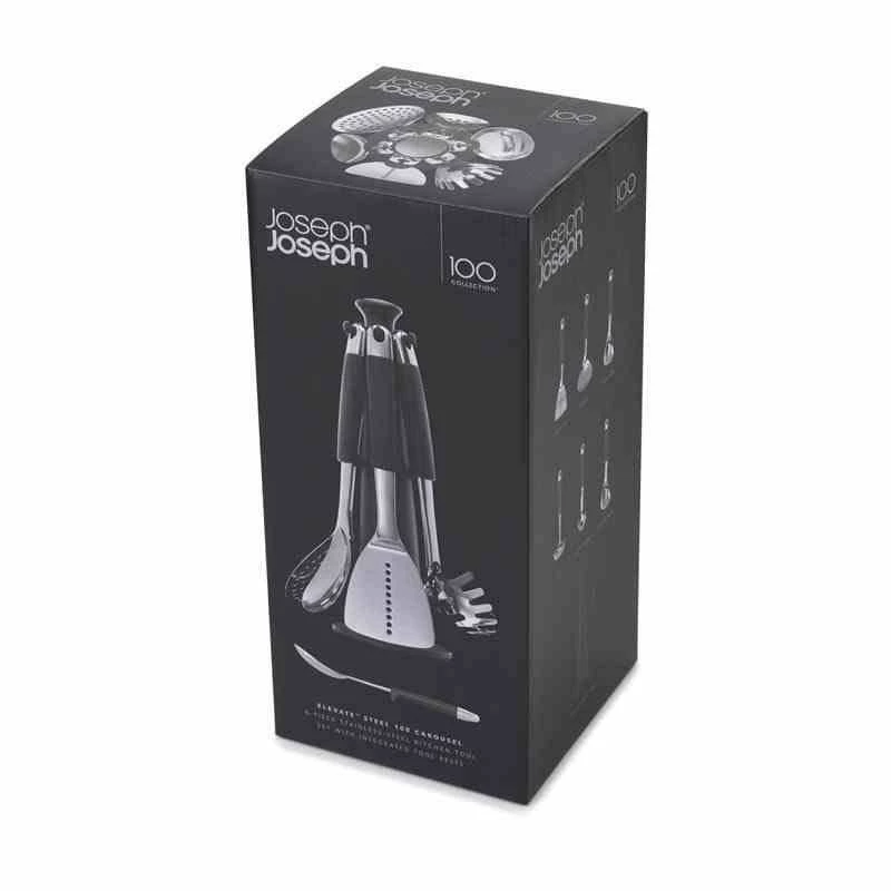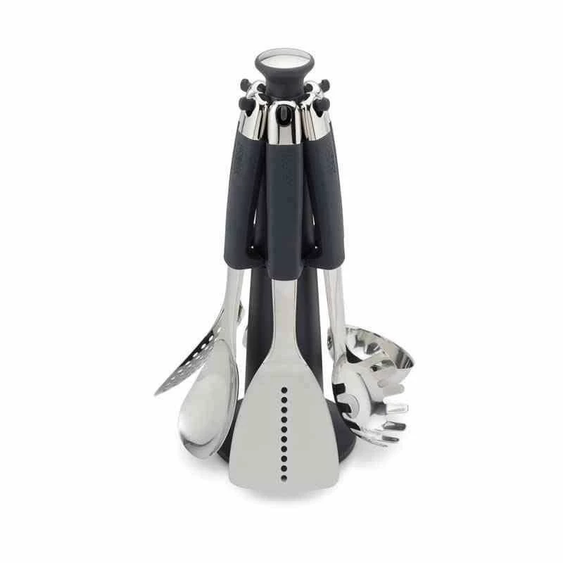 - w komplecie: chochelka, łyżka cedzakowa, łyżka kuchenna, łyżka do spaghetti, łopatka z otworami, łyżka z otworami oraz obrotowy stojak z antypoślizgową podstawą,