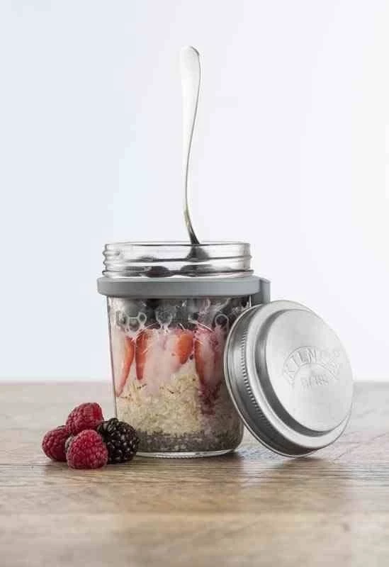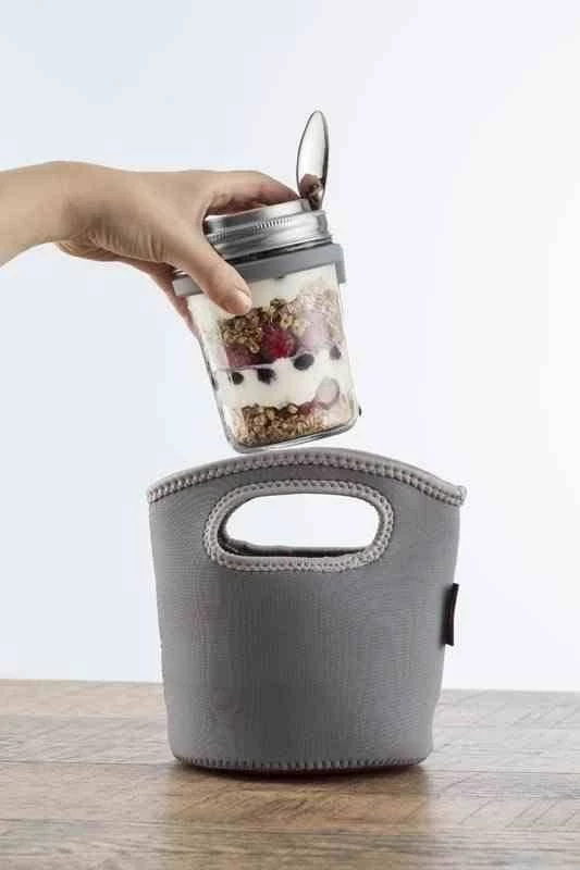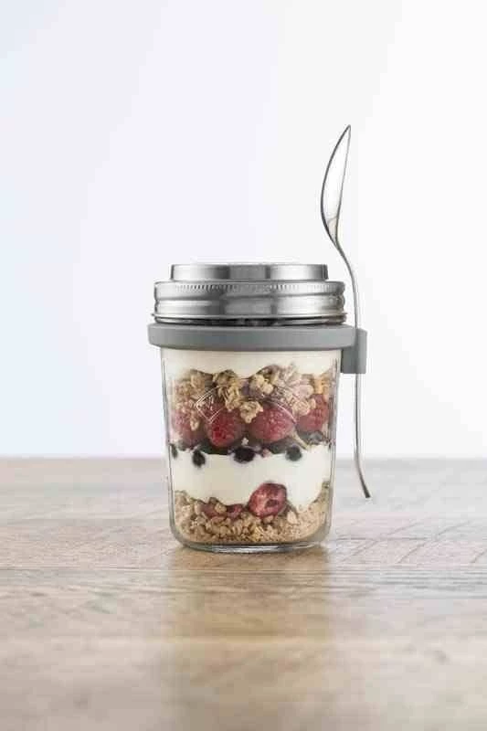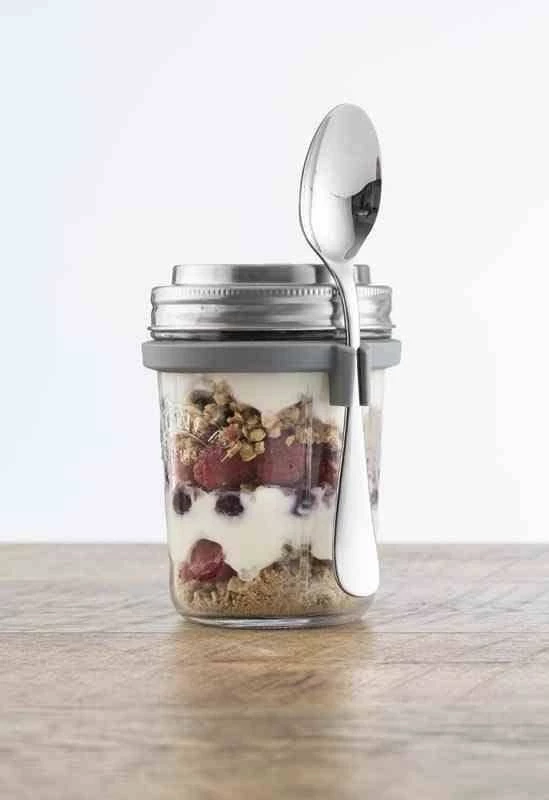 - w komplecie: słoik z szerokim wlewem o pojemności 350 ml, stalowe: zakrętka (można używać jako miarki) oraz łyżka i silikonowy uchwyt na łyżkę,