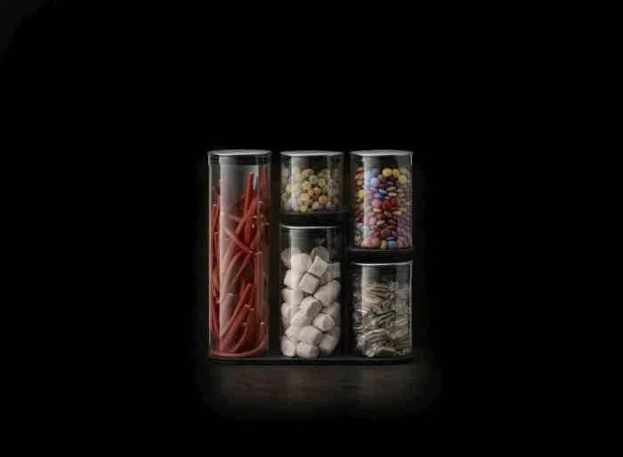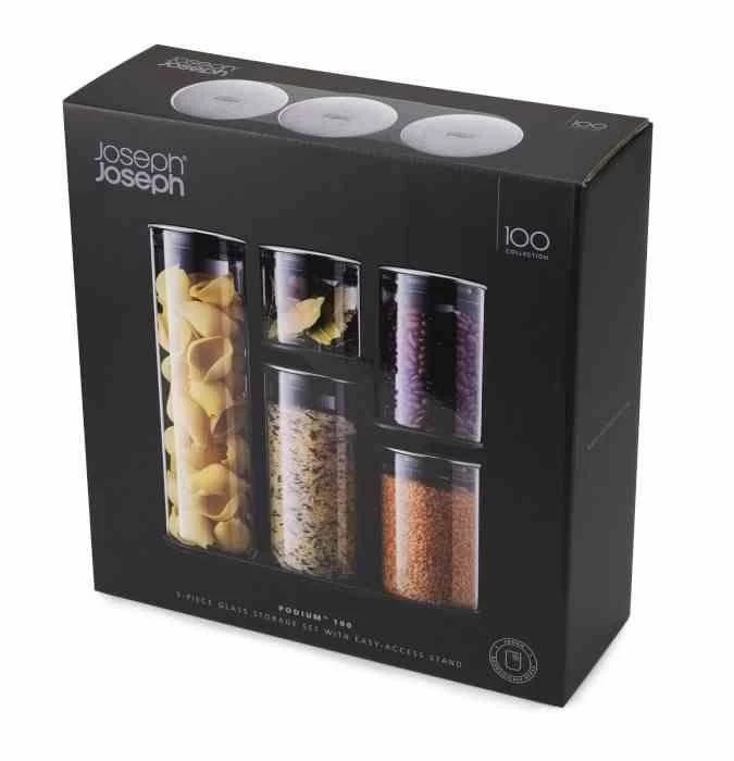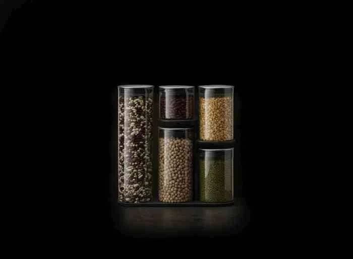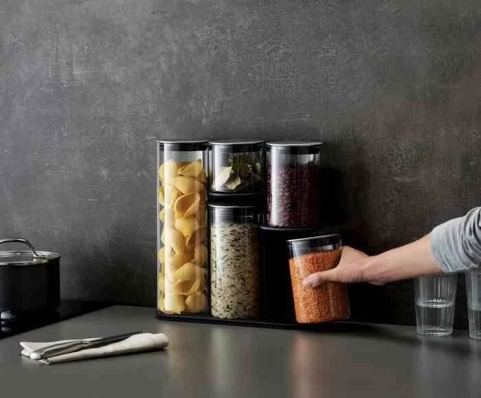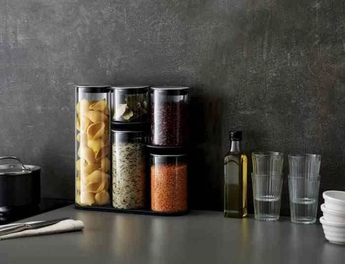 - zestaw pojemników na np. makaron, mąkę, ryż, cukier itp. umieszczonych na stojaku,