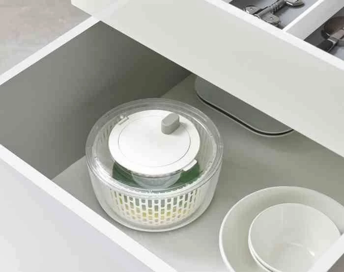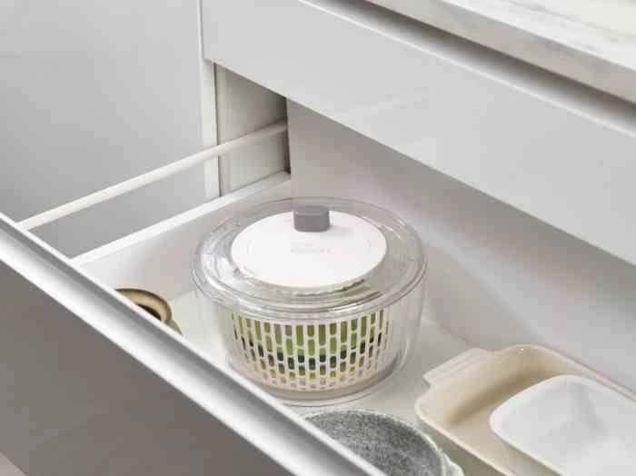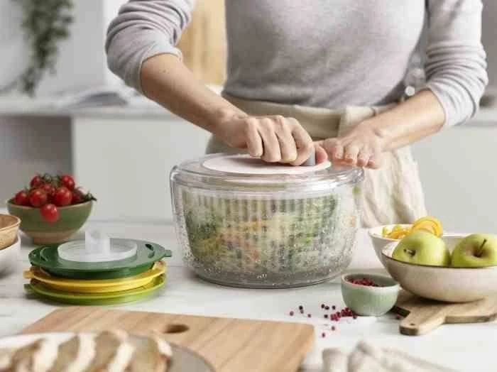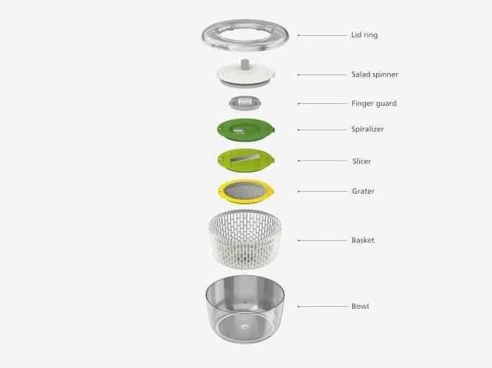 - składa się z miski, durszlaka, 3 wkładek, osłony na palce, mechanizmu wirówki z korbką oraz pierścienia zamykającego,