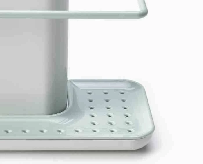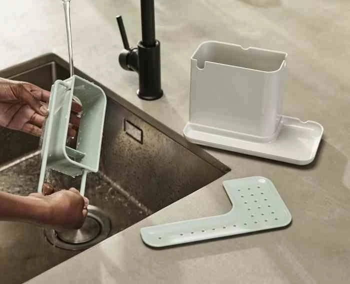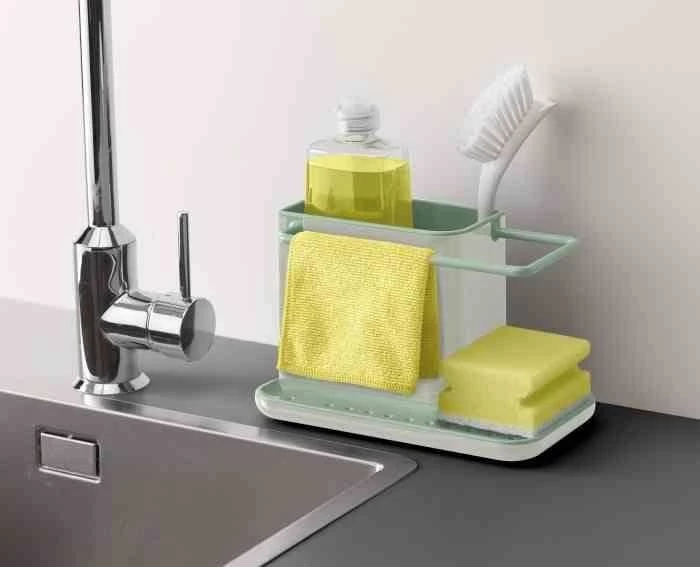 Pojemnik na akcesoria do zmywania pozwala na organizację akcesoriów do zmywania.Duży pojemnik na płyn do mycia naczyń i szczotkę. Specjalny wieszak na wilgotną ściereczkę, oraz miejsce na gąbkę z odpływem dzięki czemu gąbka schnie, a woda zbiera się w zbiorniczku pod nią. Cały pojemnik można z łatwością rozłożyć do mycia. Idealne rozwiązanie jeżeli wokół zlewu nie ma za wiele miejsca.