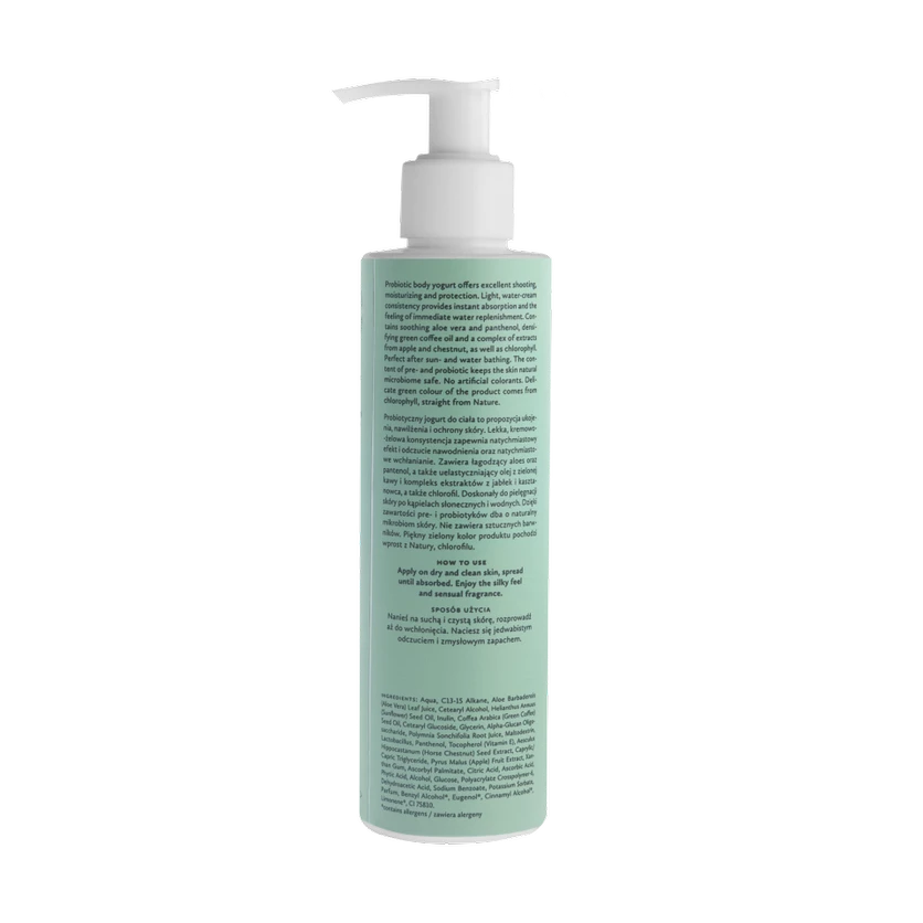 W formule znajdziesz aloes i pantenol wspierające komfort skóry, olej z zielonej kawy poprawiający jej jędrność oraz ekstrakty z jabłka i kasztanowca, które odświeżają i uelastyczniają. Kompleks pre- i probiotyków wspiera mikrobiom, pomagając przywrócić równowagę, a chlorofil nadaje jogurtowi świeży, roślinny odcień i wspiera regenerację naskórka.