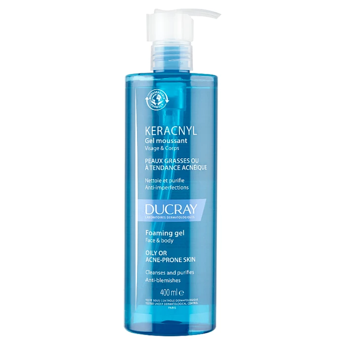 - KERACNYL ŻEL PIENIĄCY: produkt oczyszczający do twarzy i ciała do skóry tłustej lub skłonnej do trądzik