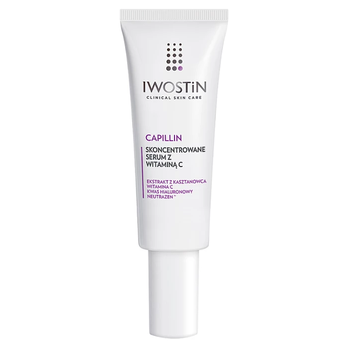 Iwostin Capillin skoncentrowane serum z witaminą C zostało stworzone z myślą o codziennej pielęgnacji dojrzałej skóry naczynkowej. Widocznie redukuje zaczerwienienia i rumień Zapewnia natychmiastowe uczucie komfortu i ukojenia Nawilża i ujędrnia skórę oraz wygładza drobne linie i zmarszczki Zawarta w nim witamina C rozjaśnia skórę i działa antyoksydacyjnie Delikatna konsystencja serum doskonale rozprowadza się na skórze, czyniąc ją zadbaną i promienną. Innowacyjna formuła: - Ekstrakt z kasztanowca redukuje widoczność rumienia - Witamina C wykazuje działanie antyoksdacyjne i rozjaśnia przebarwienia - Kwas hialuronowy sprawia, że skóra jest nawilżona i wygładzona, a zmarszczki mniej widoczne - Neutrazen zmniejsza nadreaktywność skóry - Alantoina łagodzi podrażnienia Potwierdzona skuteczność: - Redukuje zaczerwienienia i rumień wg 100 % badanych - Wyrównuje koloryt skóry wg 96 % badanych - Wygładza i redukuje zmarszczki - Intensywnie nawilża i regeneruje Formuła bogata w starannie dobrane składniki Skuteczność potwierdzona klinicznie.