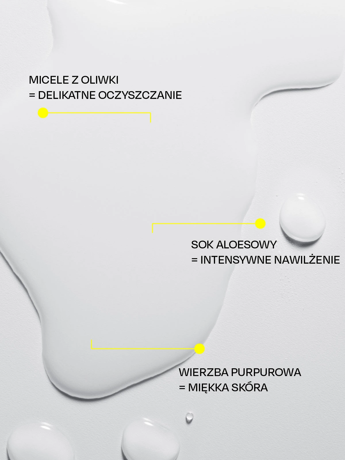 - Zielone micele z oliwki – naturalne cząsteczki samoorganizujące się w micele, delikatnie absorbują makijaż i zanieczyszczenia z powierzchni skóry