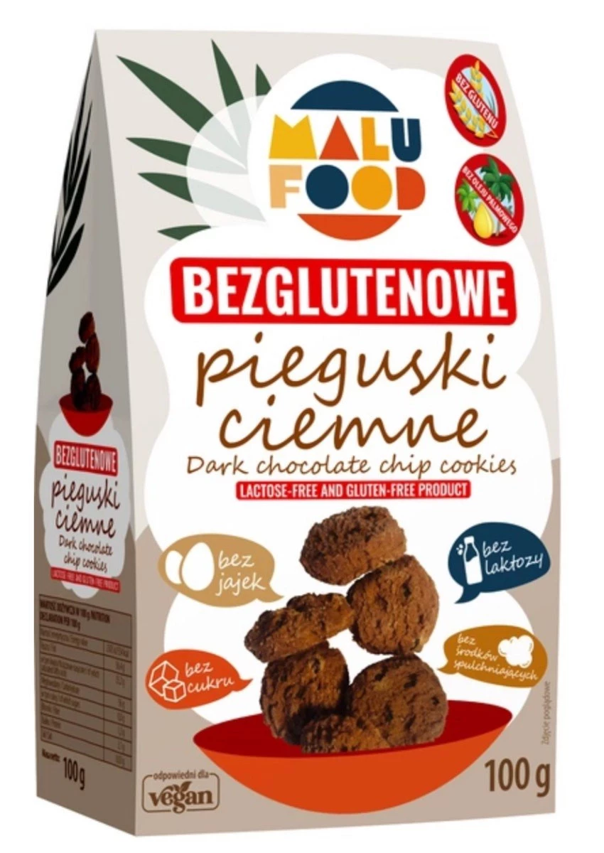 Ciemne pieguski charakteryzują się intensywnym kakaowym smakiem. Chrupiące kawałki zatopione w ciasteczkach dodają im wyjątkowej tekstury. Malu Food dba o to, aby skład produktów był prosty i naturalny, dlatego nie znajdziesz w nich sztucznych dodatków, w tym konserwantów, barwników i aromatów.