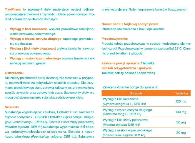 - Suplement diety z wyciągami roślinnymi wspierającymi trawienie i pracę układu pokarmowego.