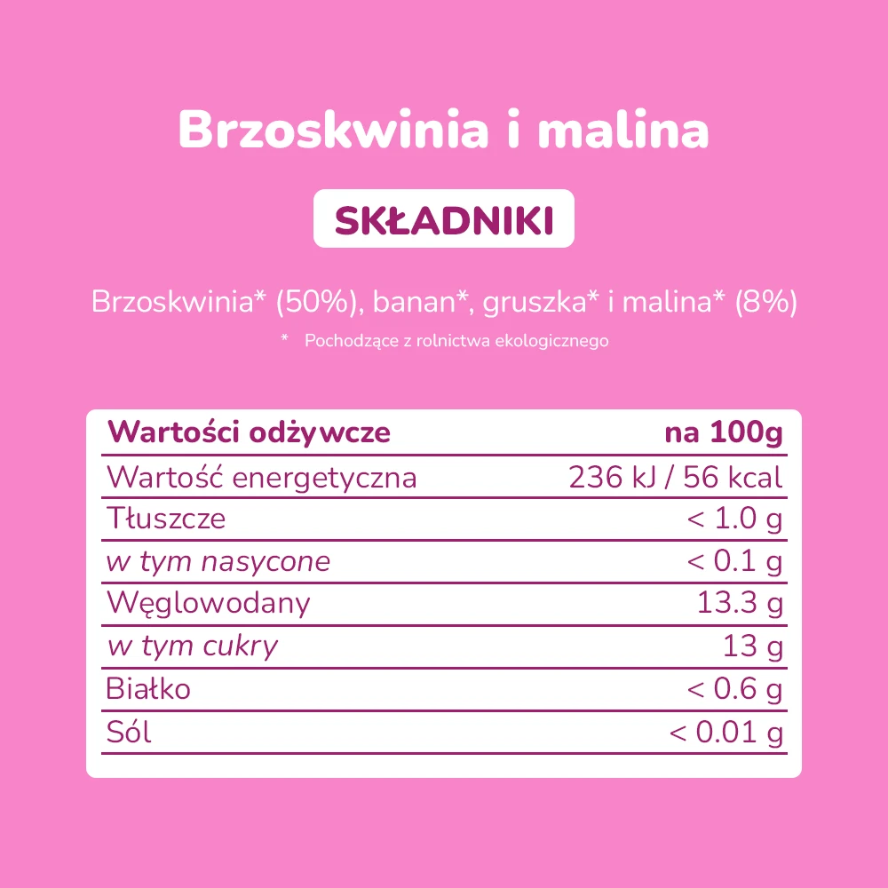 SKŁAD: brzoskwinia* (50%), banan*, gruszka* i malina* (8%);
