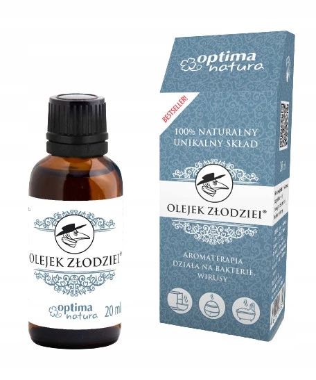 Unikalna mieszanka 100% naturalnych olejków eterycznych, znana ze swoich silnych właściwości antybakteryjnych, przeciwwirusowych i przeciwgrzybiczych. Olejek Złodziei Optima Natura to wyjątkowa kompozycja 6 naturalnych olejków o intensywnym, odświeżającym aromacie, który poprawia mikroklimat pomieszczeń, działa oczyszczająco i wspomaga odporność. Produkt przebadany dermatologicznie i w pełni naturalny – idealny do aromaterapii, kąpieli czy masażu.
