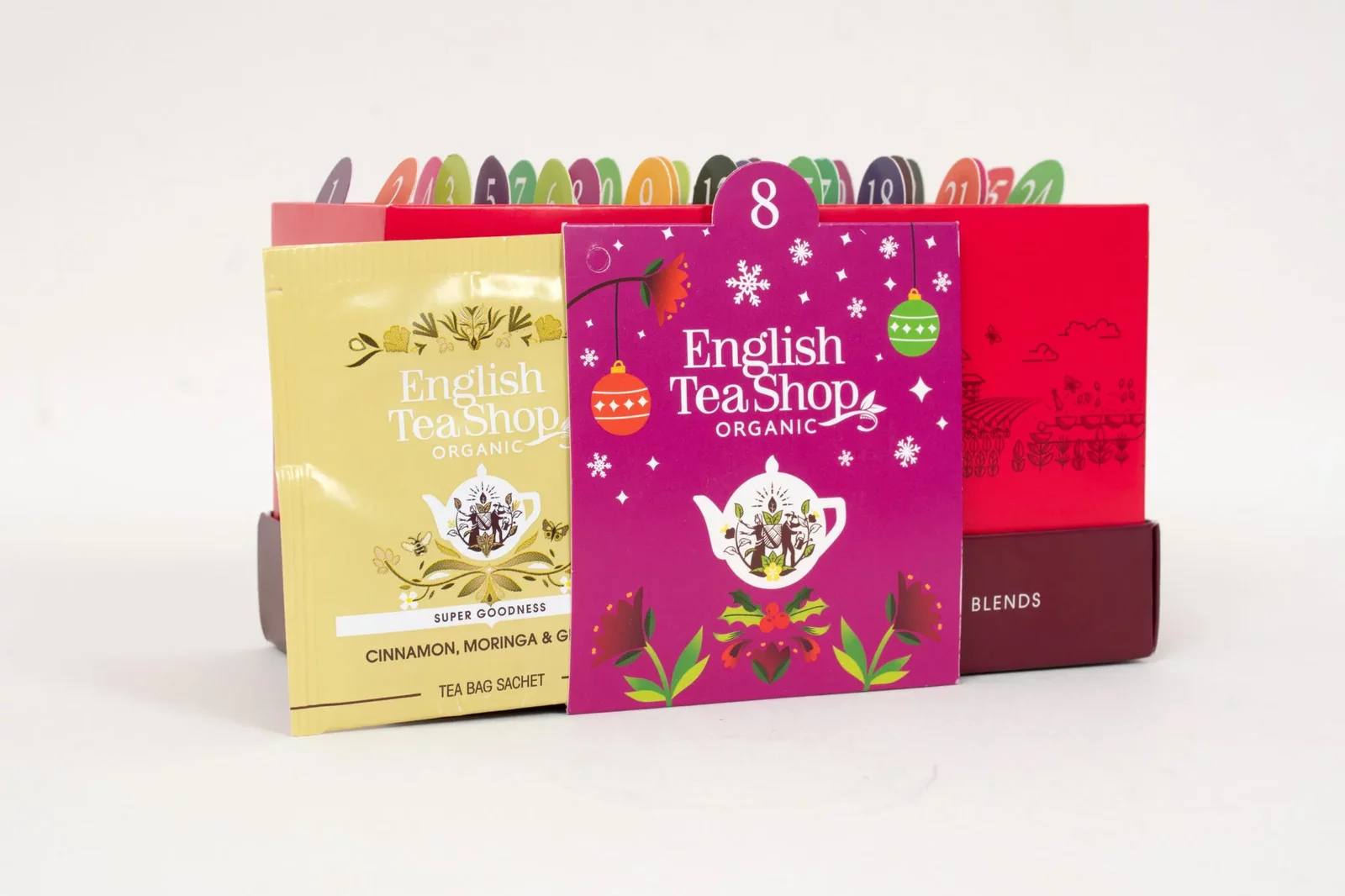 Elegancki kalendarz adwentowy z herbatami marki English Tea Shop. Idealny na prezent świąteczny dla każdego smakosza herbaty. Produkt ekologiczny, w pełni kompostowalny i neutralny klimatycznie.