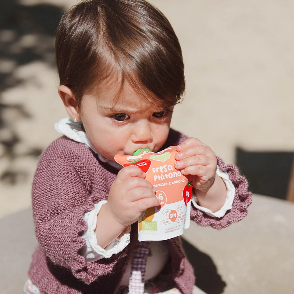 Daj swojemu dziecku smakowitą i zdrową przekąskę dzięki naszemu musowi z ekologicznymi truskawkami i bananem.