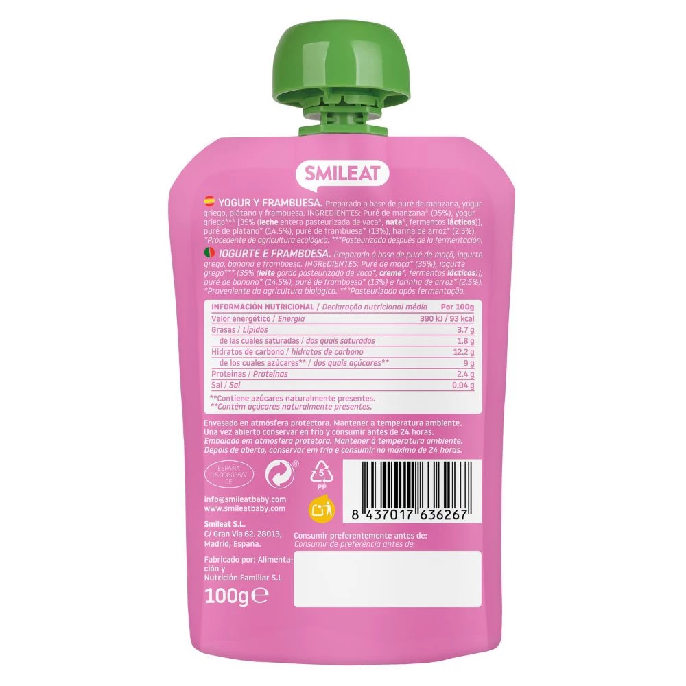 Skład: przecier jabłkowy* (35%), jogurt grecki** (pasteryzowane mleko krowie*, śmietanka*, fermenty mleczne) (35%), przecier bananowy * (14.5%), przecier malinowy * (13%) , mąka ryżowa* (2.5%);