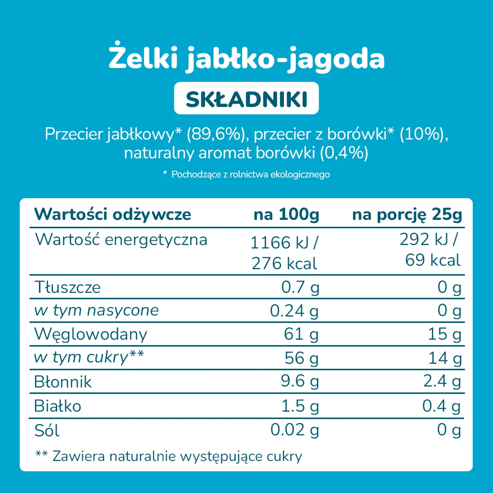 SKŁAD: przecier jabłkowy* (89,6%), przecier jagodowy*(10%), naturalny aromat jagodowy (0,4%)