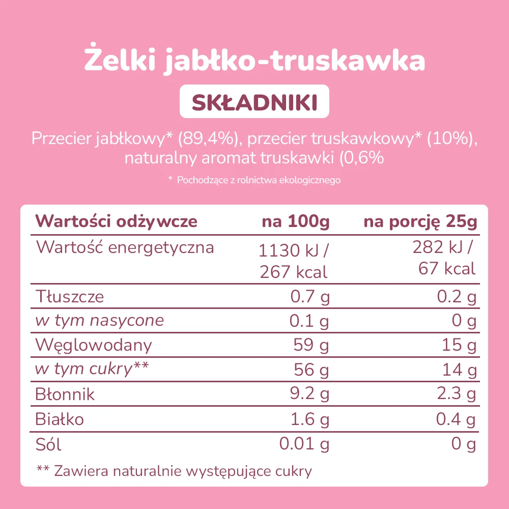SKŁAD:przecier jabłkowy* (89,4%), przecier truskawkowy*(10%), naturalny aromat truskawkowy (0,6%)