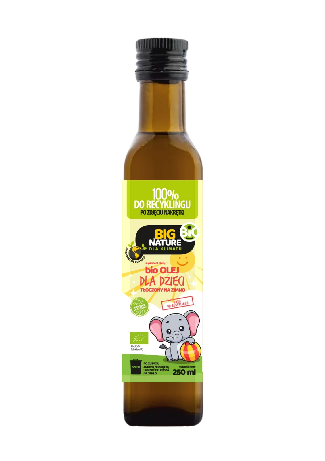 Produkt Big Nature Olej dla dzieci kwasy Omega 250 ml BIO BIG NATURE to suplement diety. Nie może być stosowany jako substytut zróżnicowanej diety. Pamiętaj o zrównoważonym sposobie żywienia i zdrowym trybie życia.- Przechowuj w chłodnym miejscu, z dala od bezpośredniego światła słonecznego.