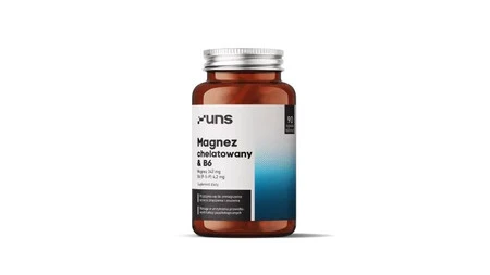 Suplement diety UNS Magnez Chelatowany & B6 to połączenie magnezu w formie dobrze przyswajalnego diglicynianu magnezu oraz witaminy B6 w aktywnej formie P-5-P (5'-fosforan pirydoksalu). To doskonałe wsparcie dla układu nerwowego, mięśni i kości, idealne dla osób aktywnych fizycznie i umysłowo.