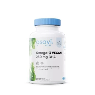 Osavi Omega-3 VEGAN Vital to suplement diety stworzony specjalnie z myślą o weganach i wegetarianach, zawierający 250 mg DHA (kwas dokozaheksaenowy) w każdej kapsułce miękkiej. Produkt jest pozyskiwany z alg, co czyni go idealnym źródłem omega-3 dla osób niespożywających produktów pochodzenia zwierzęcego. Kapsułki są wolne od żelatyny i innych składników zwierzęcych, co potwierdza ich wegański charakter.