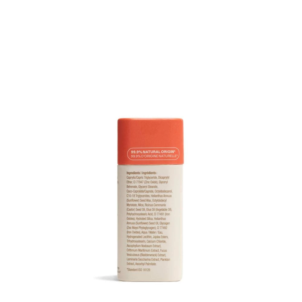 INCI: Caprylic/Capric Triglyceride, Dicaprylyl Ether, CI 77947 (Zinc Oxide), Glyceryl Behenate, Glyceryl Stearate, Coco-Caprylate/Caprate, Octyldodecanol, C10-18 Triglycerides, Helianthus Annuus (Sunflower) Seed Wax, Octyldodecyl Myristate, Mica, Ricinus Communis (Castor) Seed Oil, Olus Oil (Vegetable Oil), Polyhydroxystearic Acid, CI 77491 (Iron Oxides), Hydrated Silica, Helianthus Annuus (Sunflower) Seed Oil, Glycogen (Zea Mays Phytoglycogen), CI 77492 (Iron Oxides), Aqua / Water / Eau, Hydrogenated Lecithin, Jojoba Esters, Trihydroxystearin, Calcium Chloride, Ascophyllum Nodosum Extract, Crithmum Maritimum Extract, Fucus Vesiculosus (Bladderwrack) Extract, Laminaria Saccharina Extract, Plankton Extract, Ascorbyl Palmitate.
