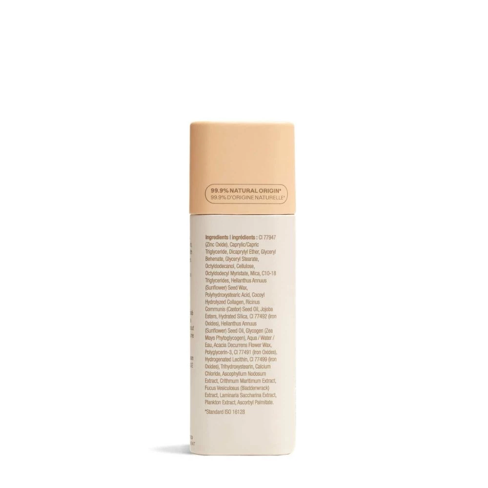 INCI: CI 77947 (Zinc Oxide), Caprylic/Capric Triglyceride, Dicaprylyl Ether, Glyceryl Behenate, Glyceryl Stearate, Octyldodecanol, Cellulose, Octyldodecyl Myristate, Mica, C10-18 Triglycerides, Helianthus Annuus (Sunflower) Seed Wax, Polyhydroxystearic Acid, Cocoyl Hydrolyzed Collagen, Ricinus Communis (Castor) Seed Oil, Jojoba Esters, Hydrated Silica, CI 77492 (Iron Oxides), Helianthus Annuus (Sunflower) Seed Oil, Glycogen (Zea Mays Phytoglycogen), Aqua / Water / Eau, Acacia Decurrens Flower Wax, Polyglycerin-3, CI 77491 (Iron Oxides), Hydrogenated Lecithin, CI 77499 (Iron Oxides), Trihydroxystearin, Calcium Chloride, Ascophyllum Nodosum Extract, Crithmum Maritimum Extract, Fucus Vesiculosus (Bladderwrack) Extract, Laminaria Saccharina Extract, Plankton Extract, Ascorbyl Palmitate.