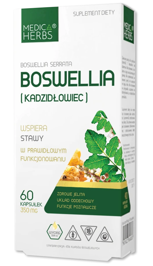 Produkt MEDICA HERBS Boswellia (Kadzidłowiec) 350mg, 60 kaps. Medica Herbs to suplement diety. Nie może być stosowany jako substytut zróżnicowanej diety. Pamiętaj o zrównoważonym sposobie żywienia i zdrowym trybie życia.- Przechowuj w chłodnym miejscu, z dala od bezpośredniego światła słonecznego.