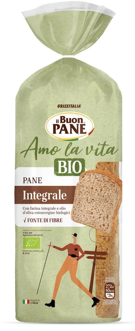 Ekologiczny chleb pszenny pełnoziarnisty z dodatkiem oliwy z oliwek extra virgin (4%) oraz dekstrozy, przygotowany na naturalnych drożdżach. Źródło błonnika pokarmowego. Produkt potraktowany alkoholem etylowym.