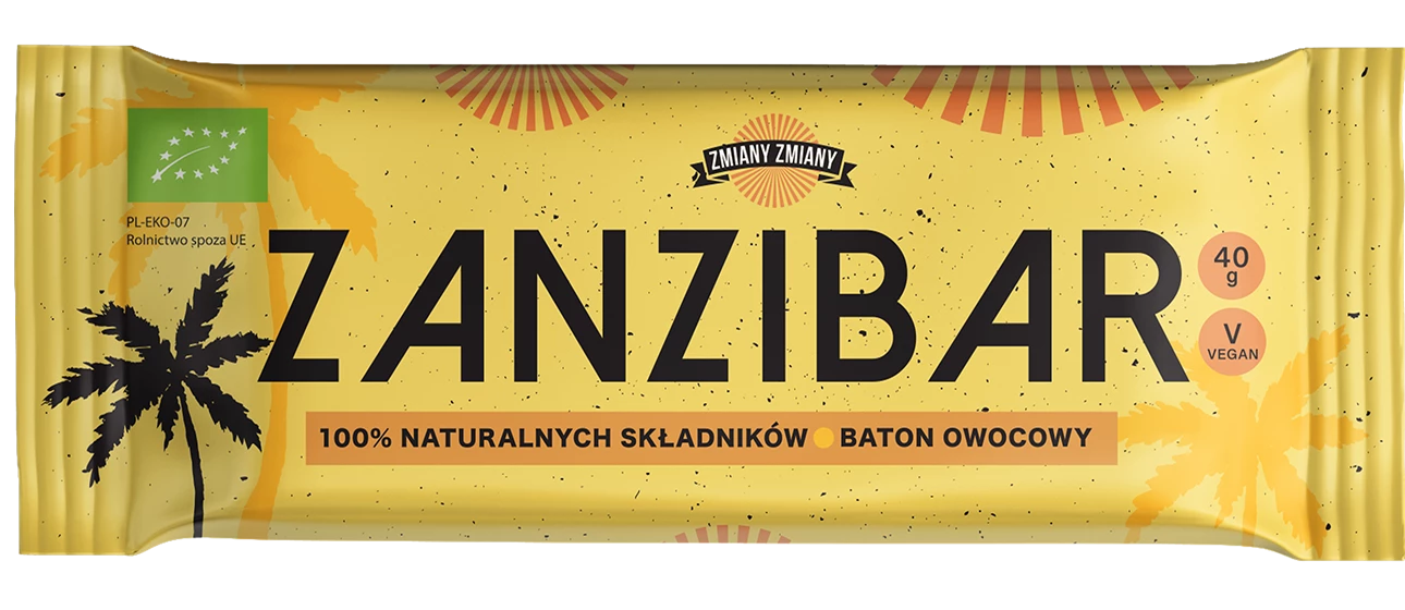 - Bio Baton owocowy "Zanzbiar" wyłącznie z naturalnych składników jakości ekologicznej. Wegański, bez dodatku cukru, bez laktozy, wykonany w technologii raw – przetworzony wyłącznie mechanicznie, bez obróbki termicznej.