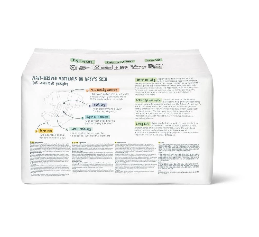 Nasze pieluszki są bezpieczne dla skóry dziecka, uzyskując pozytywne opinie dermatologów i pediatrów. Wykorzystujemy najwyższej jakości biodegradowalne materiały, a do produkcji wykorzystujemy znacznie mniej substancji chemicznych niż w przypadku pieluszek innych marek. Dzięki temu są one najlepszym wyborem dla delikatnej i wrażliwej skóry Maluszka oraz lepszym wyborem dla środowiska, ponieważ prawie każdy element pieluchy Kit & Kin ulegnie biodegradacji w ciągu 3 do 6 lat.