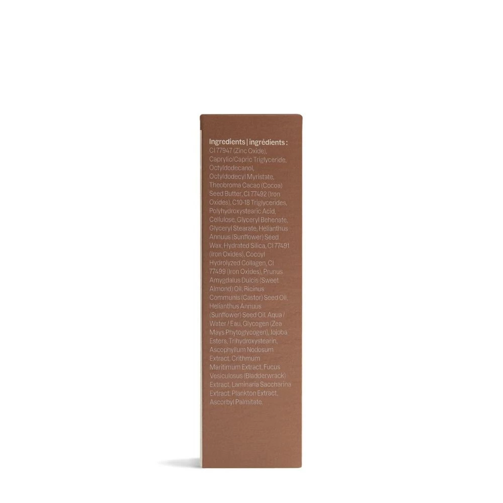 INCI: CI 77947 (Zinc Oxide), Caprylic/Capric Triglyceride, Octyldodecanol, Octyldodecyl Myristate, Theobroma Cacao (Cocoa) Seed Butter, CI 77492 (Iron Oxides), C10-18 Triglycerides, Polyhydroxystearic Acid, Cellulose, Glyceryl Behenate, Glyceryl Stearate, Helianthus Annuus (Sunflower) Seed Wax, Hydrated Silica, CI 77491 (Iron Oxides), Cocoyl Hydrolyzed Collagen, CI 77499 (Iron Oxides), Prunus Amygdalus Dulcis (Sweet Almond) Oil, Ricinus Communis (Castor) Seed Oil, Helianthus Annuus (Sunflower) Seed Oil, Aqua / Water / Eau, Glycogen (Zea Mays Phytoglycogen), Jojoba Esters, Trihydroxystearin, Ascophyllum Nodosum Extract, Crithmum Maritimum Extract, Fucus Vesiculosus (Bladderwrack) Extract, Laminaria Saccharina Extract, Plankton Extract, Ascorbyl Palmitate.
