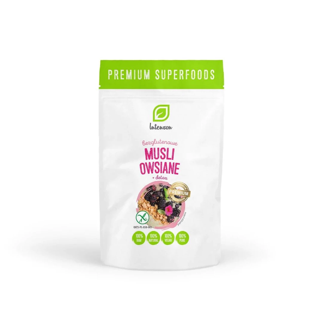 Intenson Musli bezglutenowe + Detox to wysokiej jakości produkt, który zawiera mieszankę płatków owsianych, owoców i ziaren. Stanowi doskonałą propozycję na chrupiącą przekąskę lub jako dodatek do mleka czy jogurtu. Ma w pełni naturalny skład, wolny od glutenu i produktów pochodzenia zwierzęcego, dlatego będzie odpowiedni dla wegan i wegetarian.