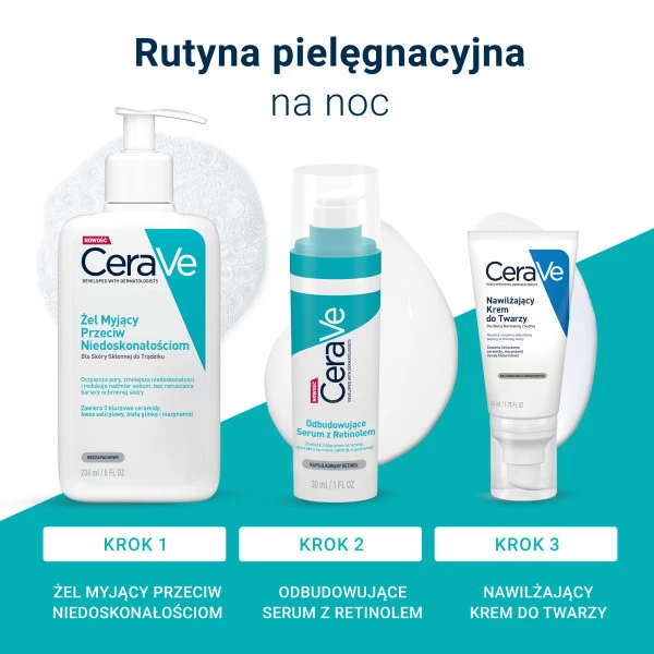 Oczyść twarz za pomocą Żelu Myjącego Przeciw Niedoskonałościom, a następnie na osuszoną skórę nałóż Odbudowujące Serum z Retinolem. Stosuj wieczorem, a rano pamiętaj o ochronie przeciwsłonecznej.