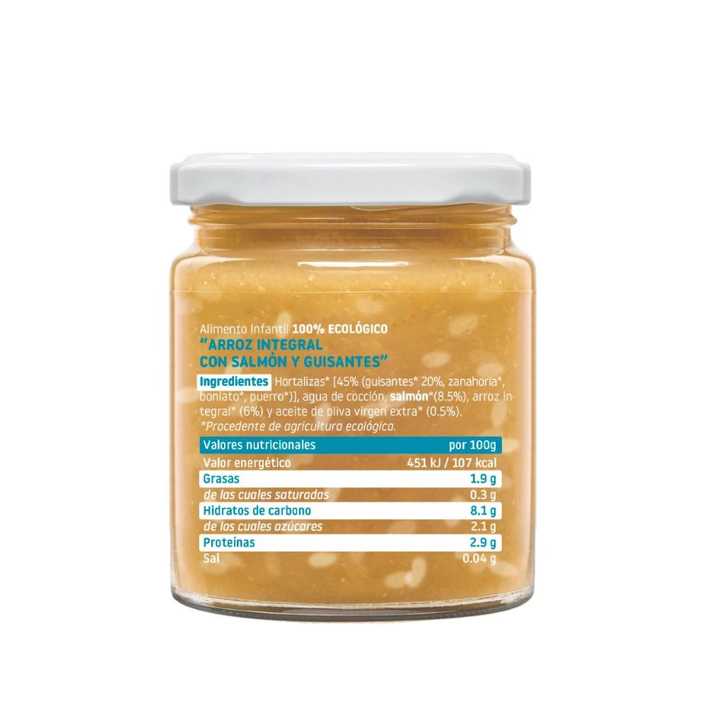 Skład: Warzywa* [45% (zielony groszek*20 %, marchew*,batat*, por*)], przegotowana woda, łosoś (8,5%), ryż pełnoziarnisty* (6%), oliwa z oliwek najwyższej jakości z pierwszego tłoczenia* (0,5%) *Z upraw ekologicznych