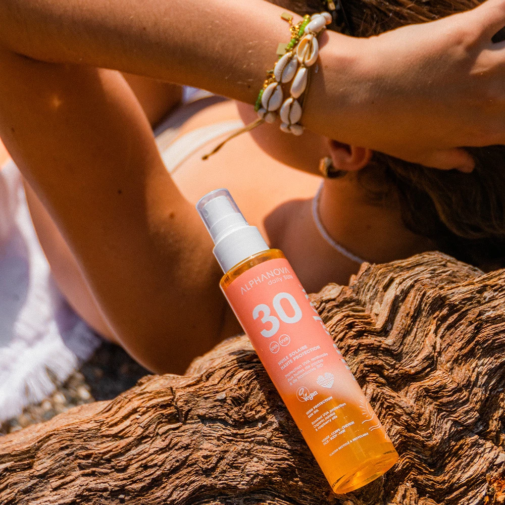 Olejek do opalania o wysokiej ochronie SPF 30. Wodoodporna formuła nowej generacji wzbogacona o olej kokosowy, organiczny olej jojoba i organiczny olej malinowy. Pierwszy produkt na rynku, który ma zwiększoną ochronę przed promieniami UVA, odpowiadającymi za starzenie się skóry i brązowe plamy. Ten olejek do opalania zawiera ponad 82% składników pochodzenia naturalnego i 44% składników ORGANICZNYCH. Jego bogata konsystencja chroni, odżywia i wzmacnia skórę, nadając satynowy efekt. Można go również nakładać na włosy, aby uzyskać jedwabistą, lśniącą teksturę. Jego egzotyczny zapach Monoï urzeka wszystkie zmysły. Dla całej rodziny, od 3 roku życia. Butelka z recyklingu i nadająca się do recyklingu. UVB 30 / UVA 33. INNOWACYJNY KOMPLEKS UVA-BOOST Promienie UVA mają nieodwracalne skutki: starzenie się skóry, brązowe plamy, oparzenia i nowotwory. Dostępne obecnie na rynku produkty do opalania zapewniają ochronę przed promieniowaniem UVA odpowiadającą 1/3 ochrony przed promieniowaniem UVB, czyli około 20 dla indeksu 50+. Alphanova Daily Sun® wprowadza innowację dzięki nowemu kompleksowi UVA Boost, który po raz pierwszy gwarantuje 2 razy większą ochronę przed promieniowaniem UVA niż standard europejski: nasza ochrona przed promieniowaniem UVA jest prawie tak wysoka, jak ochrona przed promieniowaniem UVB. W rezultacie skóra jest lepiej chroniona, zmniejszając starzenie się skóry związane z ekspozycją i brązowe plamy. KORZYŚCI PŁYNĄCE Z OLEJKU DO OPALANIA O WYSOKIEJ OCHRONIE SPF 30 : FORMUŁA W 82% POCHODZENIA NATURALNEGO I WEGAŃSKIEGO TAK SAMO SKUTECZNY W WALCE Z UVA JAK UVB NIEWIDOCZNA, POZBAWIONA SMUG OCHRONA FILTRY PRZECIWSŁONECZNE NOWEJ GENERACJI ZAPACH MONOI FORMUŁA PRZYJAZNA DLA ŚRODOWISKA PLASTIKOWA BUTELKA Z RECYKLINGU WODOODPORNY / NIETŁUSTY / NIEKLEJĄCY SIĘ JAK STOSOWAĆ OLEJEK DO OPALANIA SPF 30 Wstrząśnij przed użyciem. Nałóż produkt równomiernie na chroniony obszar (twarz, ciało i włosy) 30 minut przed ekspozycją. Najpierw spryskaj dłoń, a następnie nałóż na twarz. Często powtarzaj aplikację, zwłaszcza po pływaniu lub wytarciu ręcznikiem. Nie wystawiaj małych dzieci na bezpośrednie działanie promieni słonecznych. Noś koszulkę ochronną, okulary przeciwsłoneczne i czapkę. Unikaj ekspozycji między godziną 11 a 15. Niewystarczająca ilość produktu obniża poziom ochrony. Nadmierna ekspozycja na słońce jest zagrożeniem dla zdrowia. Przechowywać z dala od światła i ciepła. Unikać kontaktu z oczami. SKŁAD OLEJKU DO OPALANIA SPF 30 Brassica Campestris Seed Oil*, Triethyl Citrate, Dicaprylyl Carbonate, Diethylamino Hydroxybenzoyl Hexyl Benzoate, Ethylhexyl Triazone, Bis-Ethylhexyloxyphenol Methoxyphenyl Triazine, Simmondsia Chinensis Seed Oil*, Parfum, Cocos Nucifera Oil*, Rubus Idaeus Seed Oil*, Helianthus Annuus Seed Oil, Tocopherol *Składnik pochodzący z upraw ekologicznych