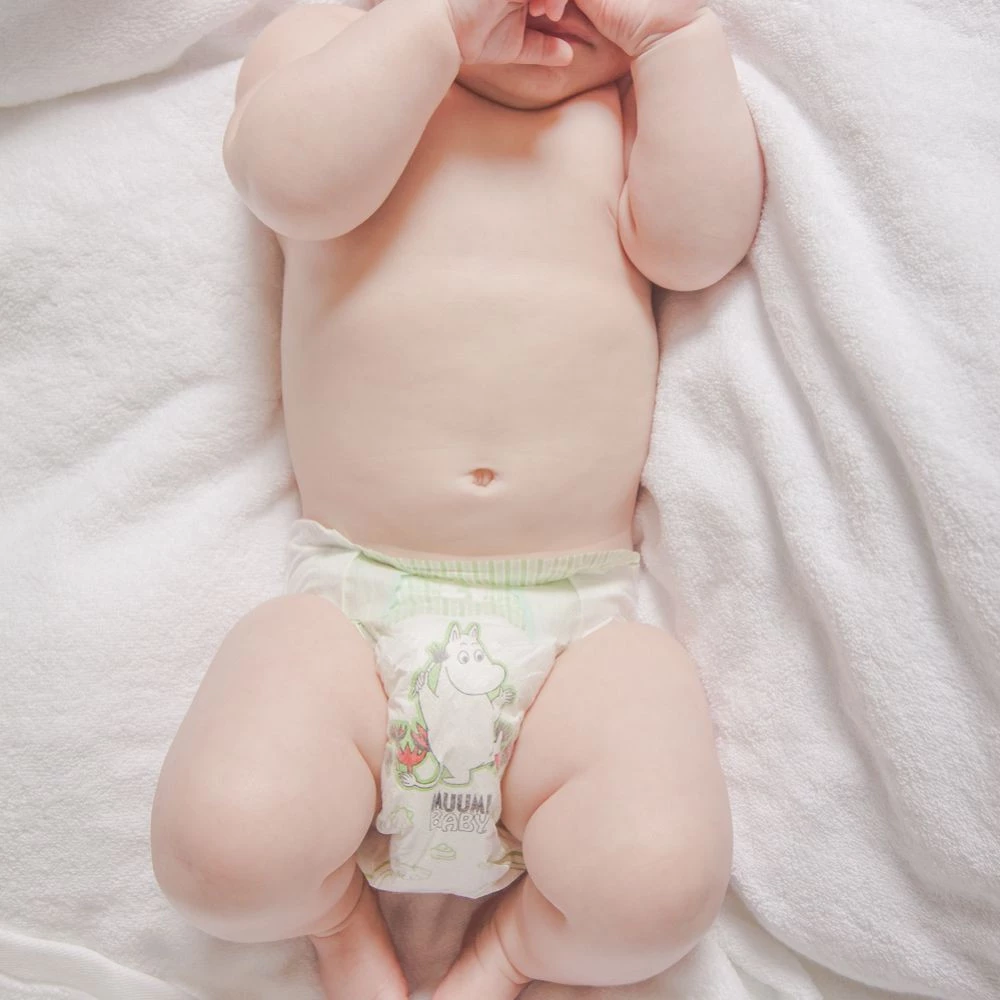 Te wyjątkowe, wysokiej jakości pieluszki, produkowane w Finlandii, wykonane są wyłącznie z czystych i bezpiecznych surowców. W procesie ich produkcji do wybielania masy celulozowej nie używa się agresywnego chloru, którego śladowe ilości pozostają w typowych pieluszkach, lecz tlenu przyjaznego zarówno dla skóry dziecka jak i środowiska. Pieluszki Moomin Baby nie są nasączone żadnym kremem ani substancjami zapachowymi. Ich miękka powierzchnia wewnętrzna wykonana jest z materiału przepuszczającego powietrze. Warstwa zewnętrzna przypomina w dotyku tkaninę, a szczelne ściągacze przy nóżkach idealnie zapobiegają przeciekaniu zawartości.