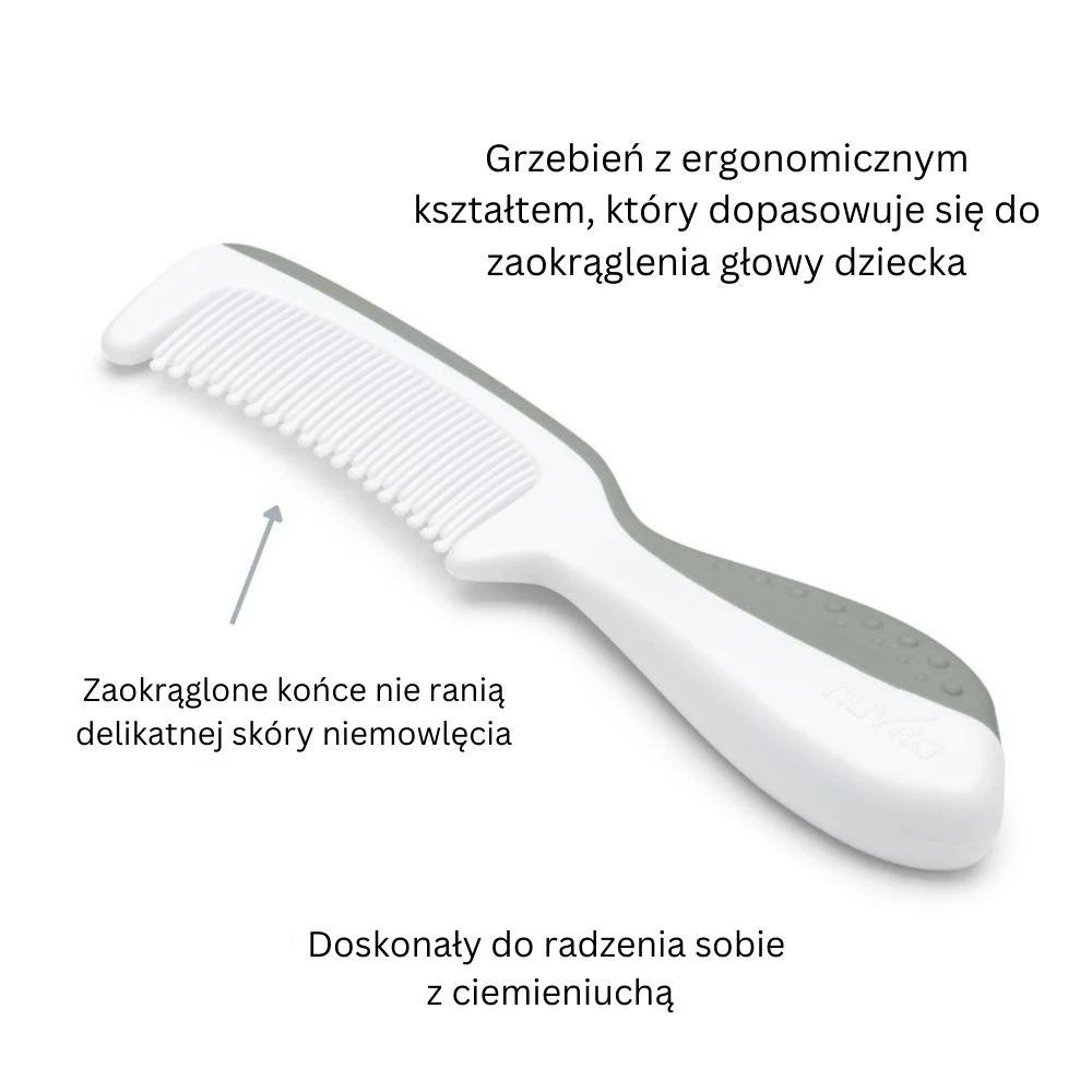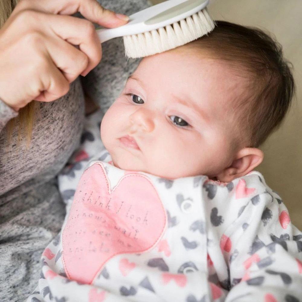 Szczotka z naturalnym włosiem i drewnianym grzbietem zadba o główkę dziecka. Grzebień ma zaokrąglone końcówki, żeby delikatnie masować i uniknąć zadrapania delikatnej głowy maluszka. Może być używany do usuwania ciemieniuszki.
