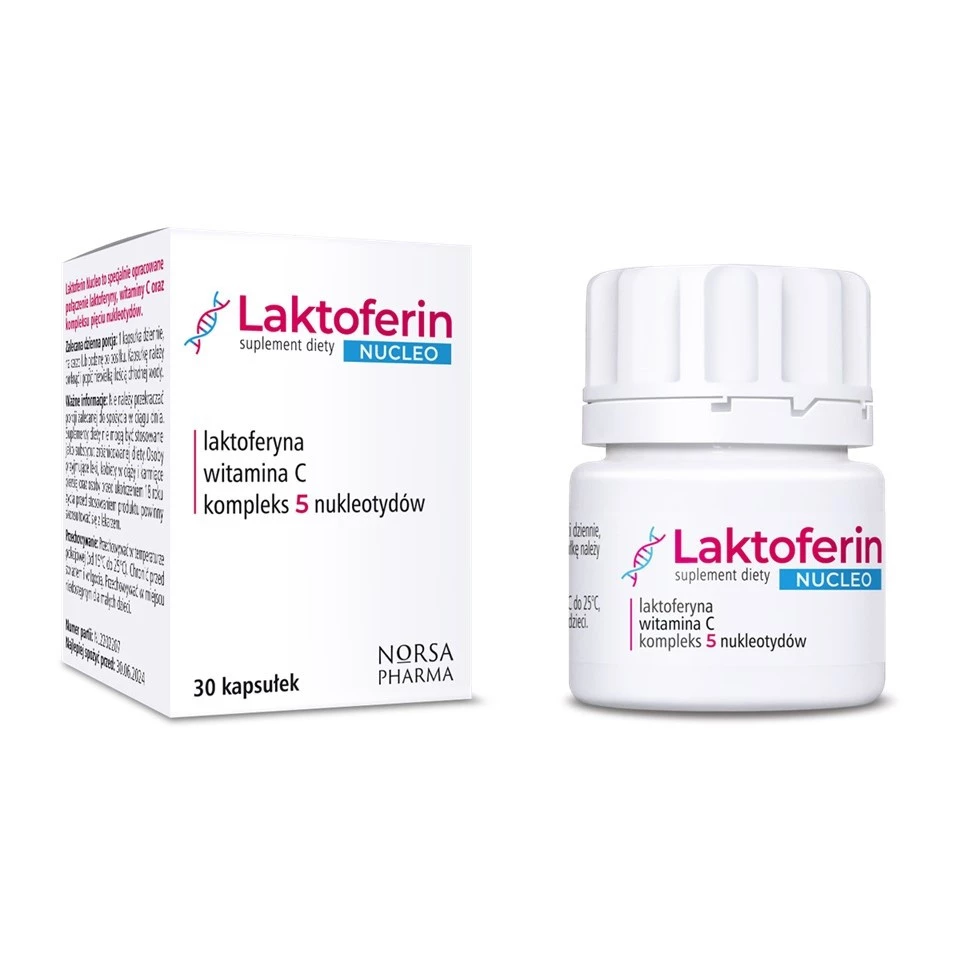 - Norsa Pharma Lactoferin Nucleo to suplement diety ze składnikami rekomendowanymi w celu zwiększenia odporności organizmu. Zawiera połączenie 5 nukleotydów, laktoferyny oraz łagodnej formy witaminy C.