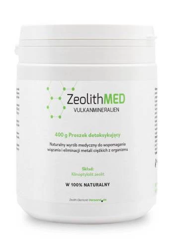 ZeolithMED ® Klinoptylolit Zeolit proszek 400 g to naturalny minerał wulkaniczny o wysokiej porowatości, który wiąże i usuwa zanieczyszczenia z organizmu dzięki wymianie jonowej i adsorpcji. Proszek ZeolithMED jest w 100% naturalny, wykonany z mechanicznie aktywowanego klinoptylolitu o średniej wielkości cząstek 35 µm, bez nanocząsteczek. Jest to naturalny wyrób medyczny do wspomagania wiązania i eliminacji metali ciężkich z organizmu.