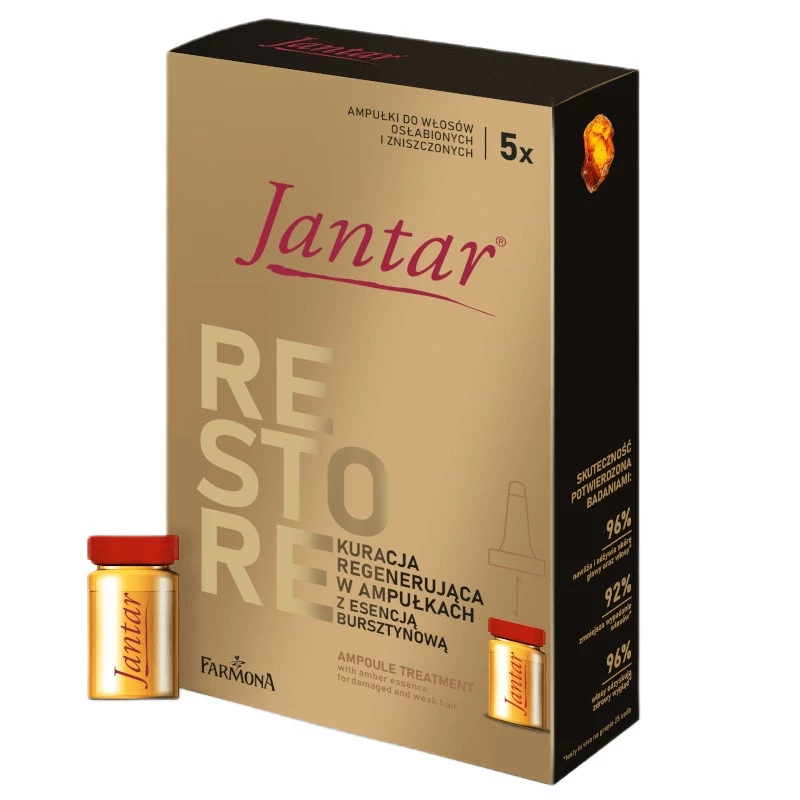 <p>Bogata w składniki aktywne receptura gwarantuje spektakularne efekty. Wyciąg z bursztynu odżywia i wzmacnia strukturę włosów, poprawiając ich kondycję. Proteiny jedwabiu nadają włosom elastyczność, miękkość i połysk. Glukoza oraz witaminy A, E i F nawilżają, intensywnie odżywiają i wzmacniają włosy. Kompleks AHA delikatnie zmiękcza naskórek, ułatwiając wnikanie substancji aktywnym, a Trichogen® stymuluje wzrost i przedłuża cykl życia włosa.</p><p><b>Składniki aktywne:<br></b>- Esencja bursztynowa - pielęgnuje, odżywia i wzmacnia strukturę włosów, poprawiając ich kondycję.<br>- Proteiny jedwabiu - nadają włosom elastyczność, miękkość i połysk.<br>- Glukoza oraz witaminy A, E i F - nawilżają, intensywnie odżywiają oraz wzmacniają.<br>- Kompleks AHA - delikatnie zmiękcza naskórek, ułatwiając wnikanie substancjom aktywnym.<br>- Trichogen® - stymuluje wzrost i przedłuża cykl życia włosa.</p><p><b>Efekty</b>: wzmocnione cebulki włosów, odżywione, zregenerowane i grubsze pasma. Przywrócona witalność, naturalny połysk i zdrowy wygląd włosów.</p><p><b>Sposób użycia</b>: Zawartość ampułki nanieść na skórę głowy i wykonać około 2 minutowy masaż. Nie spłukiwać. Stosować po każdym myciu głowy jako kurację, aż do momentu uzyskania widocznej poprawy stanu włosów, a następnie dla podtrzymania efektów raz w tygodniu. Najlepsze rezultaty przynosi systematyczne stosowanie ampułek wraz z pozostałymi produktami z linii Jantar do włosów zniszczonych i osłabionych.</p>