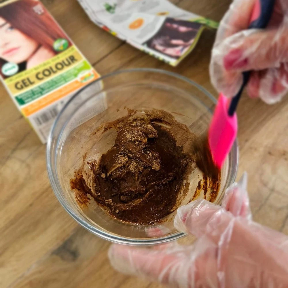 2. Załóż rękawiczki i w misce przygotuj farbę dodając proszek ziołowy do żelu Aloe Honey w odpowiednich proporcjach i dokładnie mieszając wszystkie składniki: