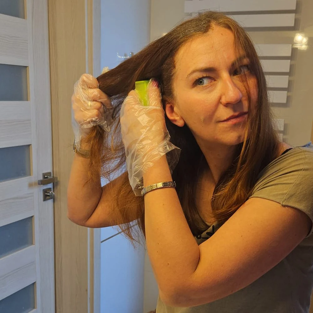 3. Użyj szczotki dołączonej do opakowania i nałóż nią miksturę na włosy, zaczynając od nowych i siwych włosów, po kilka kosmyków naraz. Palcami w rękawiczce dokładnie wmasuj miksturę w każdą sekcję, w kierunku od skóry głowy po końcówki, tak aby dotarła ona do najgłębiej położonych włosów i pozostaw na co najmniej 30 - 35 minut. Dla trudnych do farbowania/opornych siwych włosów; dodatkowo zastosuj ciepło z suszarki do włosów lub czepka termoaktywnego podczas pierwszych 10 - 15 minut. Pozostaw miksturę na minimum 30 minut po zastosowaniu ciepła.