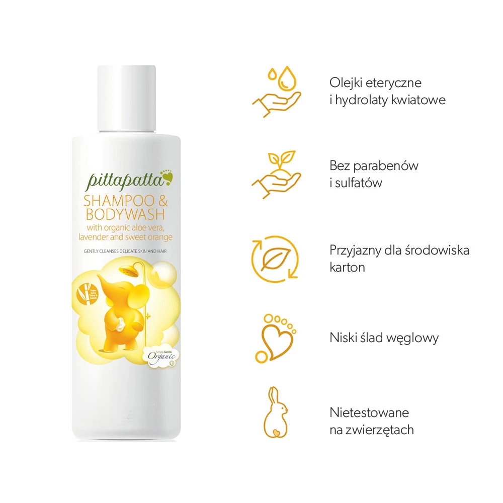 Organiczny szampon i płyn do mycia ciała dla dzieci marki Pittapatta ze zbalansowaną mieszanką nasyconą olejkami eterycznymi z rumianku i lawendy oraz esencjami z minerałów. Idealny dla delikatnej skóry i włosów. Odżywcze właściwości zapewnia roślinna baza myjąca.